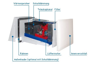 Die integrierte Schalldämmung absorbiert dabei nahezu den gesamten Außenlärm, in der Außenhaube kann eine zusätzliche Schalldämmung integriert werden. Der integrierte Filter reinigt die einströmende Luft von Insekten und Schmutzpartikeln, ein optional erhältlicher, zusätzlicher Feinfilter sogar auch von kleinsten Partikeln und Pollen.